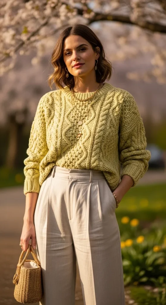 Cable-knit pieces provide warmth during early spring mornings, making them a practical and stylish choice in many European Spring Outfit Ideas, especially for cooler regions.