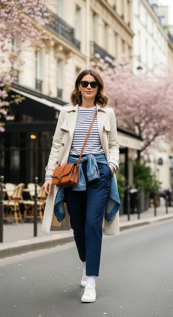 A trench coat is one of the most reliable outer layers for spring travel, offering protection from wind and light rain. When paired with denim, it creates a practical and stylish combination.